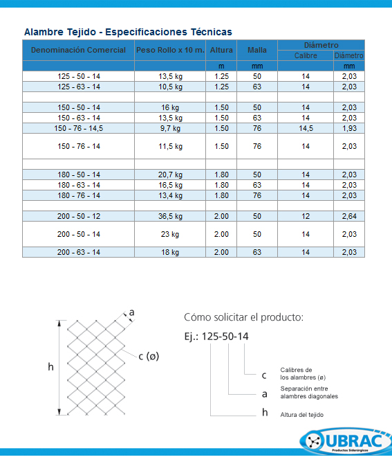 Se ofrece en una amplia variedad de dimensiones en cuanto a la abertura de la malla, la altura del tejido y el espesor de los alambres utilizados en el mismo. Presentación: rollos compactados de 10 m de longitud.